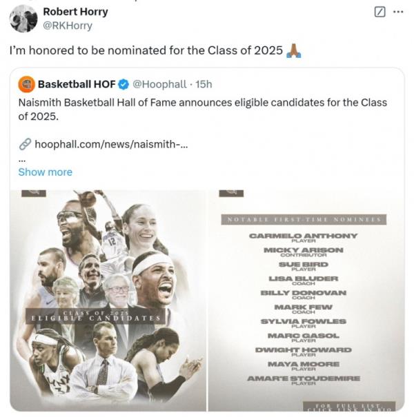 其中,七冠成員羅伯特-霍里在列。對此,他轉(zhuǎn)推評(píng)論道:“我很榮幸能夠提名2025屆奈史密斯名人堂?!?/p>